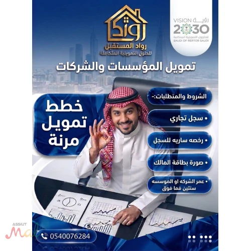 شركة رواد المستقبل للحلول التمويليه المتكامله تمويل المؤسسات والشركات الشروط والمتطلبات:- سجل تجاري رخصه ساريه للسجل صورة بطاقة المالك عمر الشركه او الموسسه سنتين فما فوق للتواصل/ابو راكان 0540076284 نستقبل اتصالاتكم على مدار 24 ساعه اذا لم يتم الرد عليك عبر الاتصال نرجو منك ارسال رساله عن طريق الواتس اب وسوف يتم الرد عليك باسرع وقت للتواصل واتس اب مباشرة https://api.whatsapp.com/send?phone=966540076284